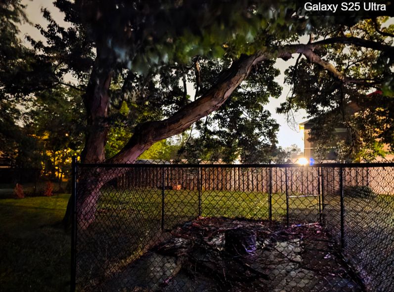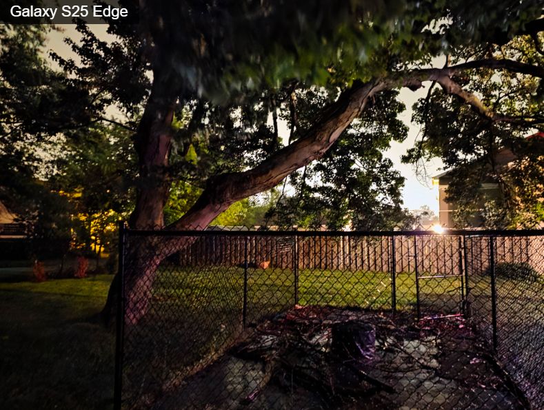 Здесь я не вижу особой разницы между S25 Edge и S25 Ultra, поскольку они правильно увеличивают экспозицию, чтобы выделить скрытые детали вокруг дерева, а также смягчают яркий источник света на заднем плане. Когда дело доходит до съёмки при слабом освещении, они могут сделать любую тёмную сцену яркой.