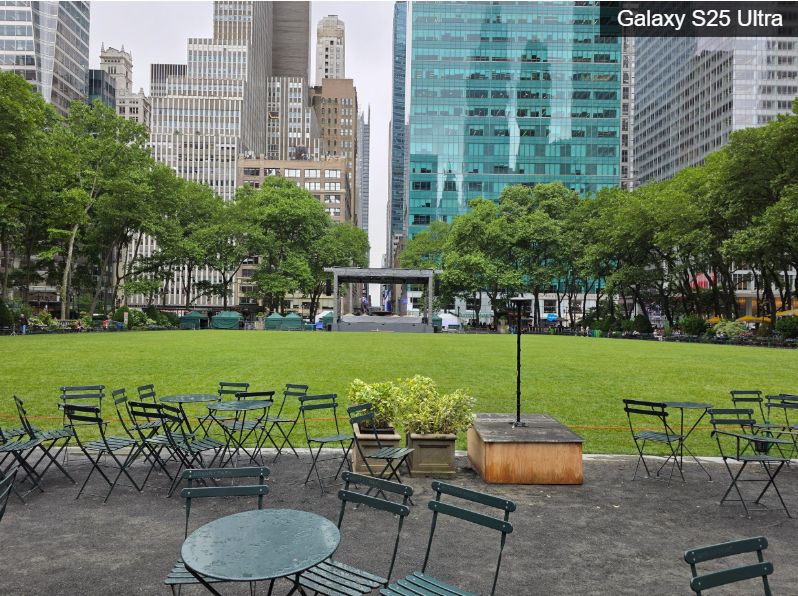 Оба телефона отлично передают всю сцену целиком, включая тени вокруг деревьев на заднем плане. Детали на переднем плане, такие как стулья с выгравированным на них названием «Брайант-парк» и деревянный ящик, выглядят одинаково. На заднем плане окружающие здания и небоскрёбы выглядят так же детально проработанными.