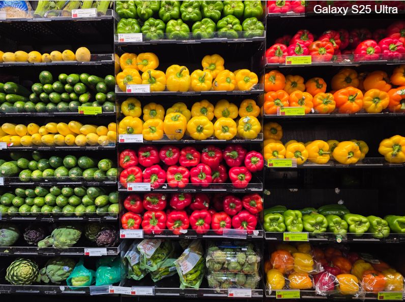 Многие цвета кажутся одинаковыми, например, жёлтый перец на средней полке и зелёный кабачок справа. Однако красный перец на верхней правой и средней полках гораздо более насыщенно окрашен, чем в S25 Ultra. Лично я не против, но по сравнению с Edge, который, на мой взгляд, всё равно насыщен по тону, это выглядит более нереалистично.