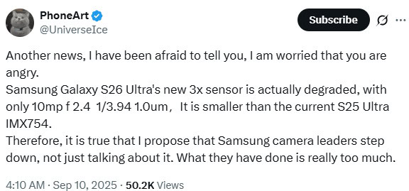 Инсайдер Ice Universe заявил в Twitter, что Galaxy S26 Ultra не получит 12-мегапиксельную 3-кратную камеру, как он утверждал ранее. Точнее, в телефоне, по-видимому, будет установлен 12-мегапиксельный сенсор, который обрезается до 10 Мп. Это означает, что нативное разрешение изображения останется неизменным по сравнению с S25 Ultra.