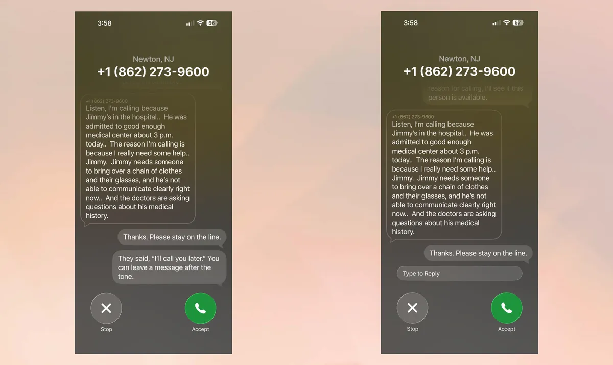 В iOS 26 при использовании функции Call Screen меня встречает помощник, который предлагает оставить сообщение о том, по какому вопросу я звоню. Что мне нравится в функции Call Screen в iOS 26, так это то, что я могу видеть расшифровку в режиме реального времени, пока человек оставляет сообщение, но поскольку эта функция не связана с Apple Intelligence, она ошибается, думая, что звонящий — это я.