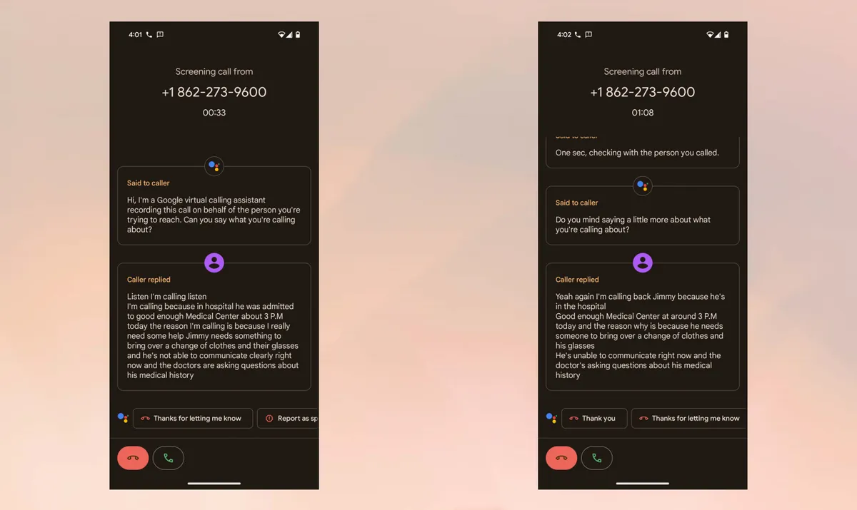 Для этого финального теста я притворился, что звоню от имени человека, который находится в больнице и нуждается в медицинской помощи. Это тот звонок, на который я бы хотел ответить, поэтому мне было очень интересно посмотреть, как Call Screen с ним справится. Вот сообщение, которое я оставил: