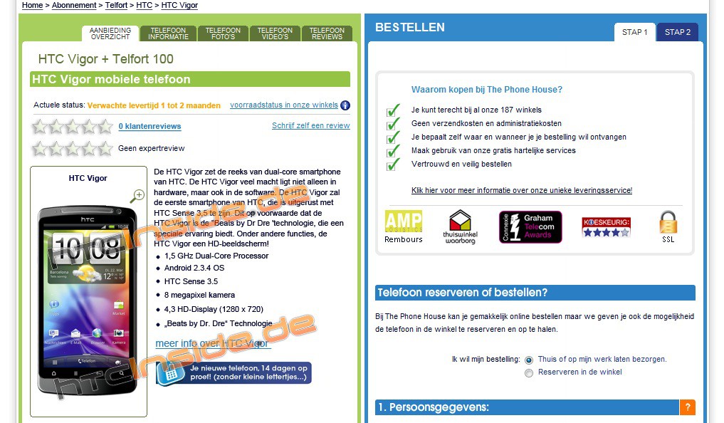 В интернете появились изображения и характеристики новых смартфонов от HTC. Судя по всему, тайваньская компания готовит для своих поклонников нечто особенное. Начнем с HTC Vigor, который случайно засветился на сайте немецкого магазина. Устройство оснащено 1,5-ГГц двухъядерным процессором и 4,3-дюймовым с невиданным еще разрешением 1280х720 точек. Кроме того, есть 8 Мп камера и улучшение звука по технологии Beats by Dr. Dre (HTC на днях приобрела эту компанию). Vigor будет работать на базе ОС Android 2.3.4 Gingerbread с оболочкой HTC Sense 3.5. Конечно, всегда есть шанс, что страничка на сайт магазина — просто подделка, но все выглядит очень убедительно.