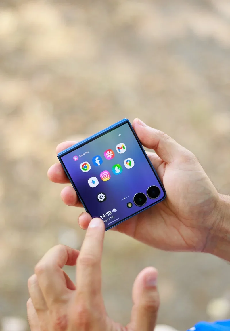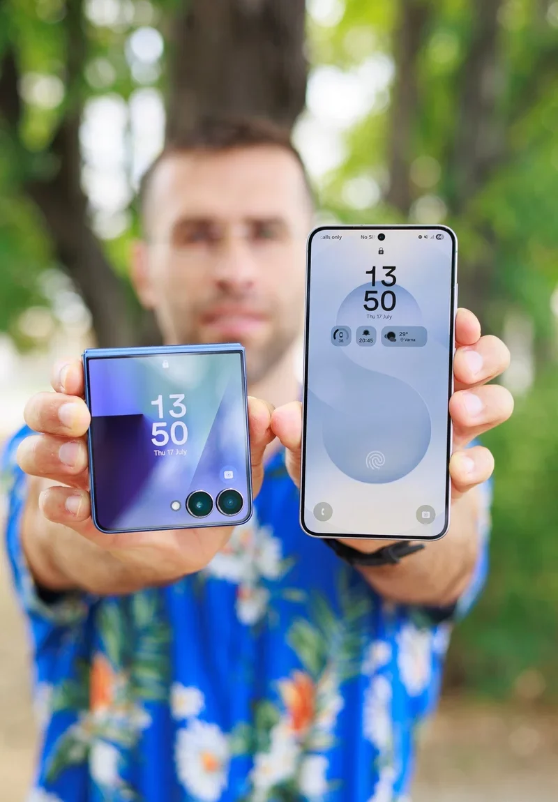 Есть и визуальный обман. Flip 7 на фото и в рекламе часто показывают сложенным, поэтому он кажется маленьким. В реальности же большую часть времени вы будете использовать его в разложенном виде, как обычный длинный смартфон. А вот S25 на промо-материалах выглядит обычно, но стоит взять его в руки — и он поражает своей миниатюрностью.