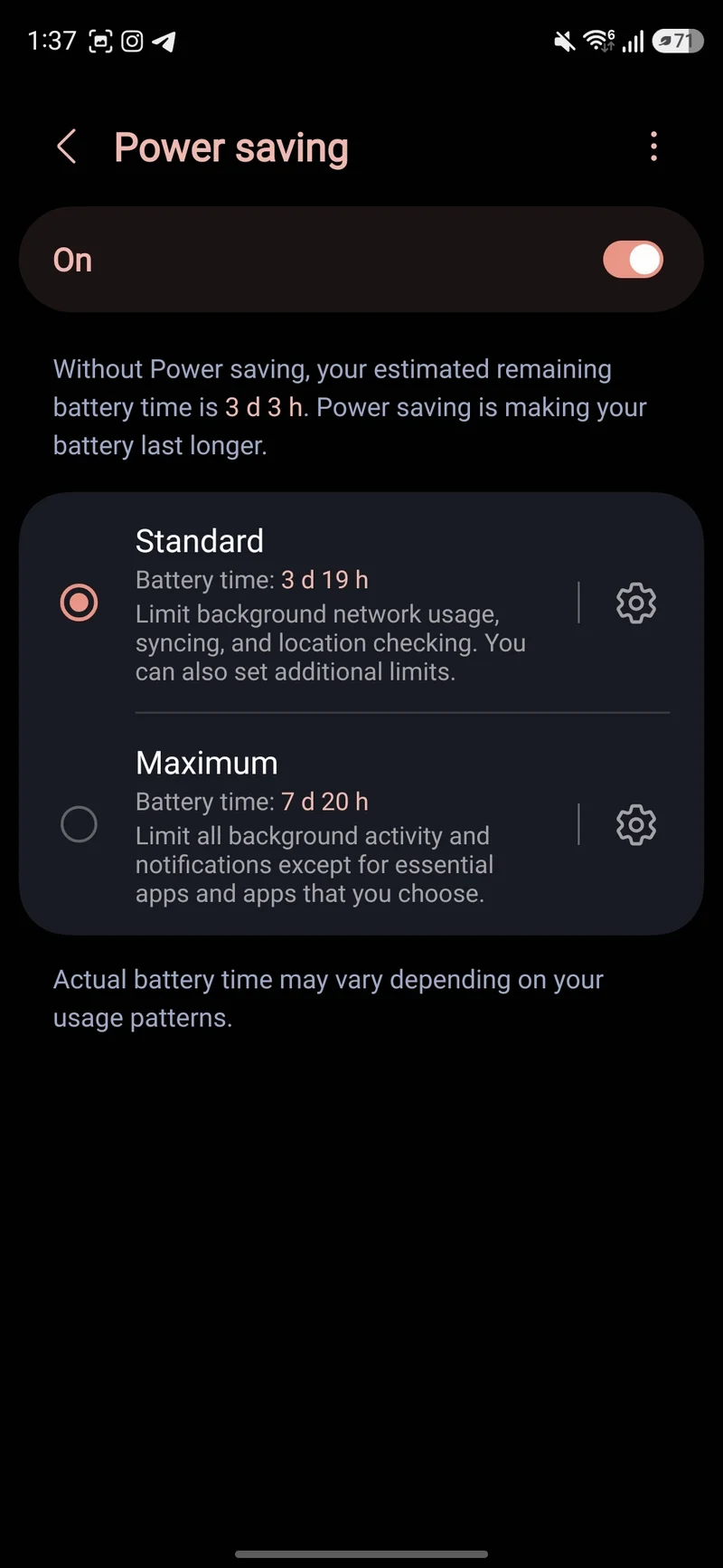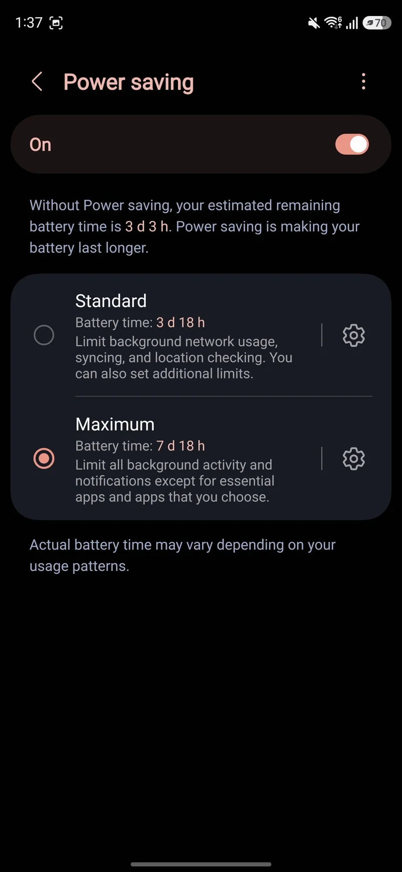 Стандартный пресет ограничивает фоновую загрузку данных, синхронизацию и службы геолокации. Вы также можете опционально отключить функцию Always On Display, снизить максимальную яркость на 10%, убрать частоту обновления 120 Гц и включить темную тему. Экран будет гаснуть уже через быстрые 30 секунд.