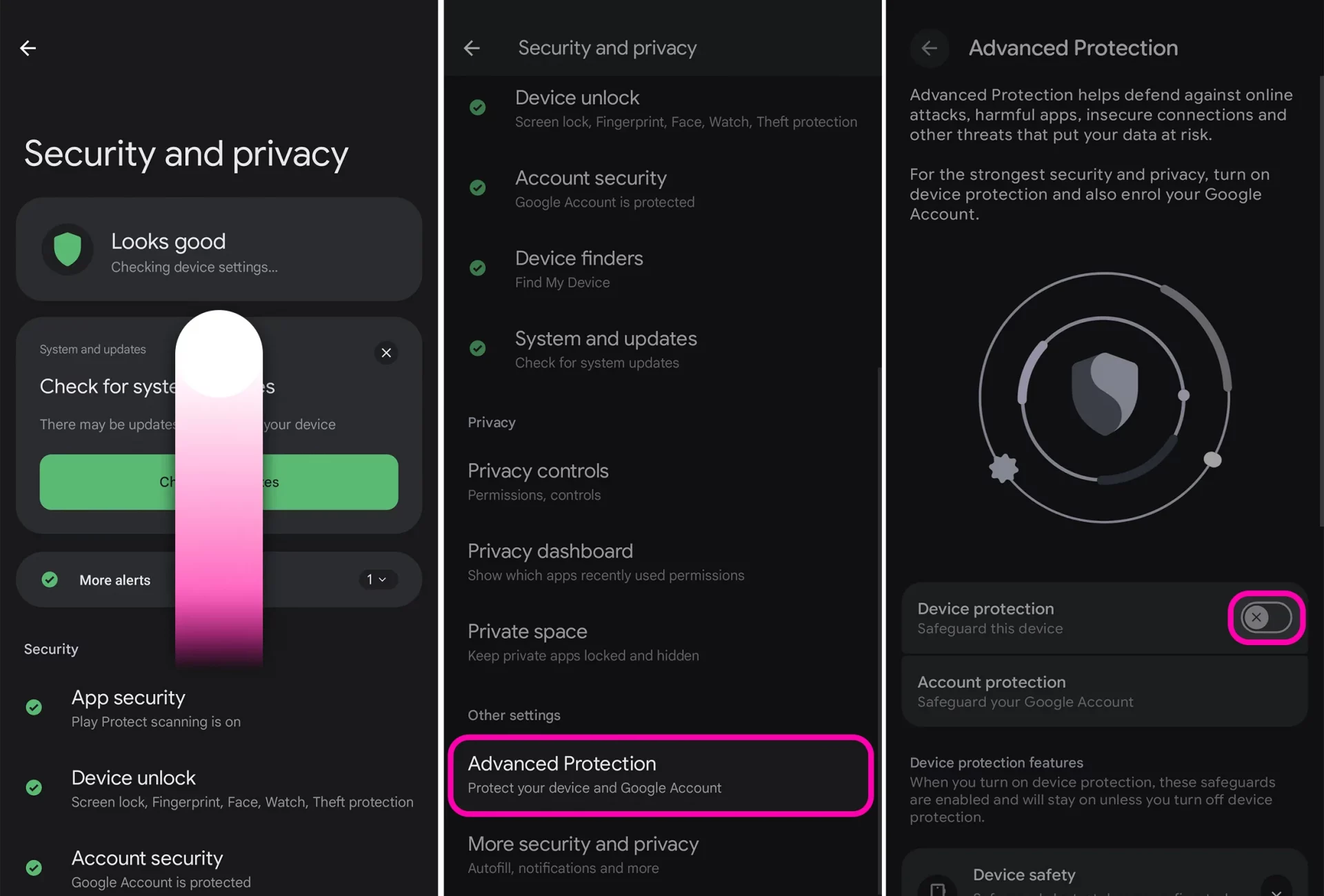Пакет «Продвинутая защита» (Advanced Protection) по умолчанию не активен, но он включает в себя целый арсенал полезных инструментов: от блокировки при краже (телефон мгновенно заблокируется, если определит, что его выхватили у вас из рук) до активации безопасного просмотра Android с обнаружением угроз и предупреждениями о подозрительных ссылках в Google Сообщениях.