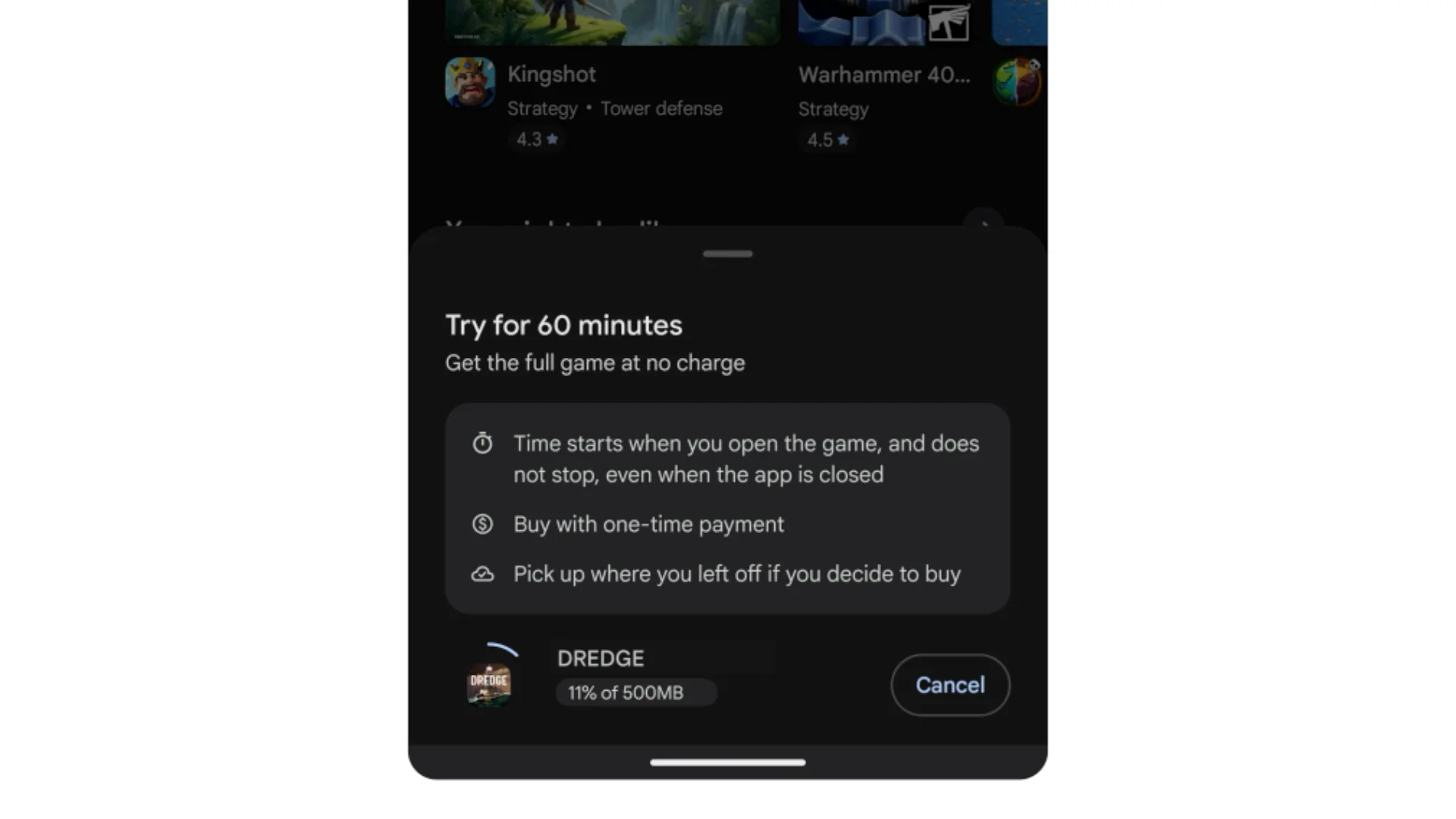 Google наконец-то внедряет функцию, о которой мечтали миллионы геймеров, — возможность бесплатно опробовать платную игру до покупки. Механика простая и гениальная: разработчик устанавливает таймер, в течение которого пользователь играет в полную версию абсолютно бесплатно. Если игра заходит — покупаешь и продолжаешь с того же места, весь прогресс сохраняется. Никаких урезанных демо-версий, никаких «начни сначала». Прощай, кот в мешке.