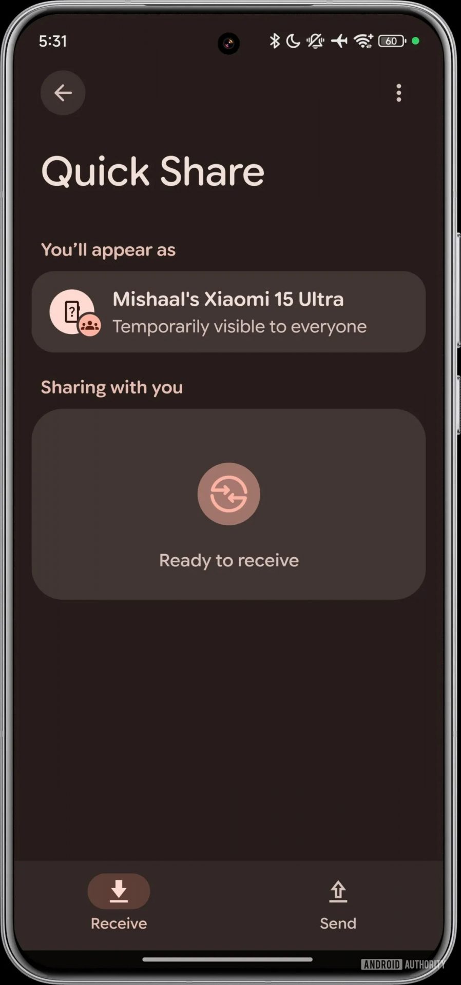 Как только вы откроете Quick Share, по умолчанию появится режим «Получить». Теперь он более заметно выделяет имя вашего устройства, а запросы от других людей, отправляющих вам файлы, стали более заметными и доступными.