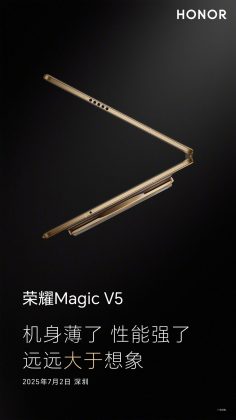 В преддверии презентации, запланированной на 2 июля, Honor активно тизерит предстоящий Magic V5. Последний тизер дает нам хорошее (хотя и не полное) представление о его дизайне. И да, он выглядит невероятно тонким. Также на задней панели видна огромная камерная выпуклость, которая, по слухам, включает 200-мегапиксельный перископический телеобъектив.