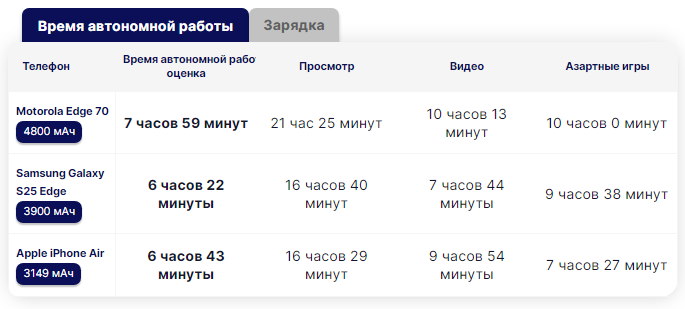 По нашим данным, время автономной работы Edge 70 в нашей лаборатории составило почти 8 часов. Это значительно больше, чем у двух его конкурентов. По сути, результаты сопоставимы с показателями Galaxy S25 Ultra.