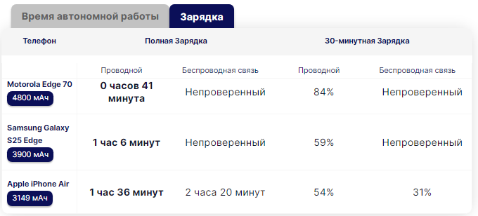 Для сравнения: Galaxy S25 Edge полностью заряжается более часа, в то время как Apple Air заряжается от обычного сетевого адаптера примерно за 1 час 30 минут.