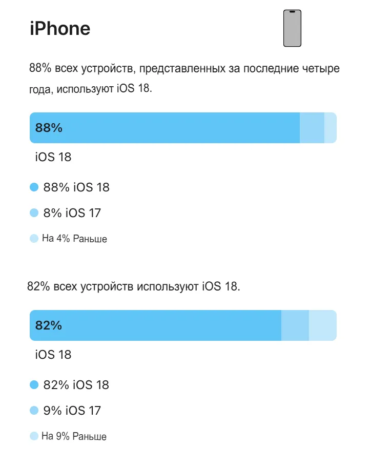 На данный момент, по данным Apple, iOS 18 установлена на 88% iPhone, выпущенных за последние четыре года, — то есть на моделях iPhone 13 и новее. В целом, 82% всех активных iPhone работают под управлением iOS 18.