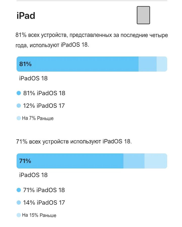 Что касается iPad, то iPadOS 18 в настоящее время установлена на 81% iPad, выпущенных за последние четыре года, и на 71% всех активных iPad. iPadOS 18 также демонстрирует более высокие темпы внедрения по сравнению с iPadOS 17 в июне прошлого года. Тогда 77% новых iPad и 68% всех iPad работали под управлением iPadOS 17.