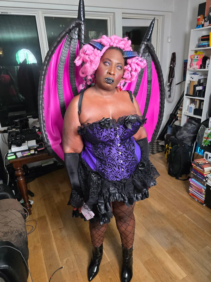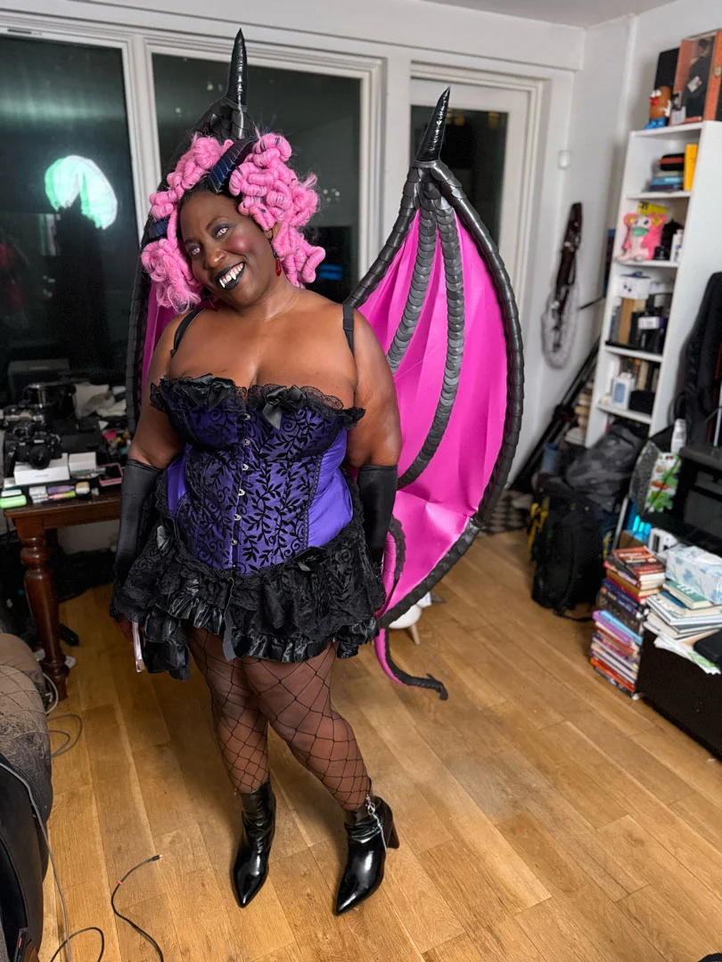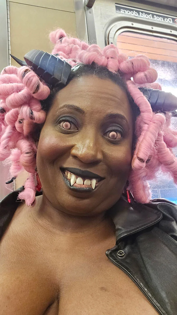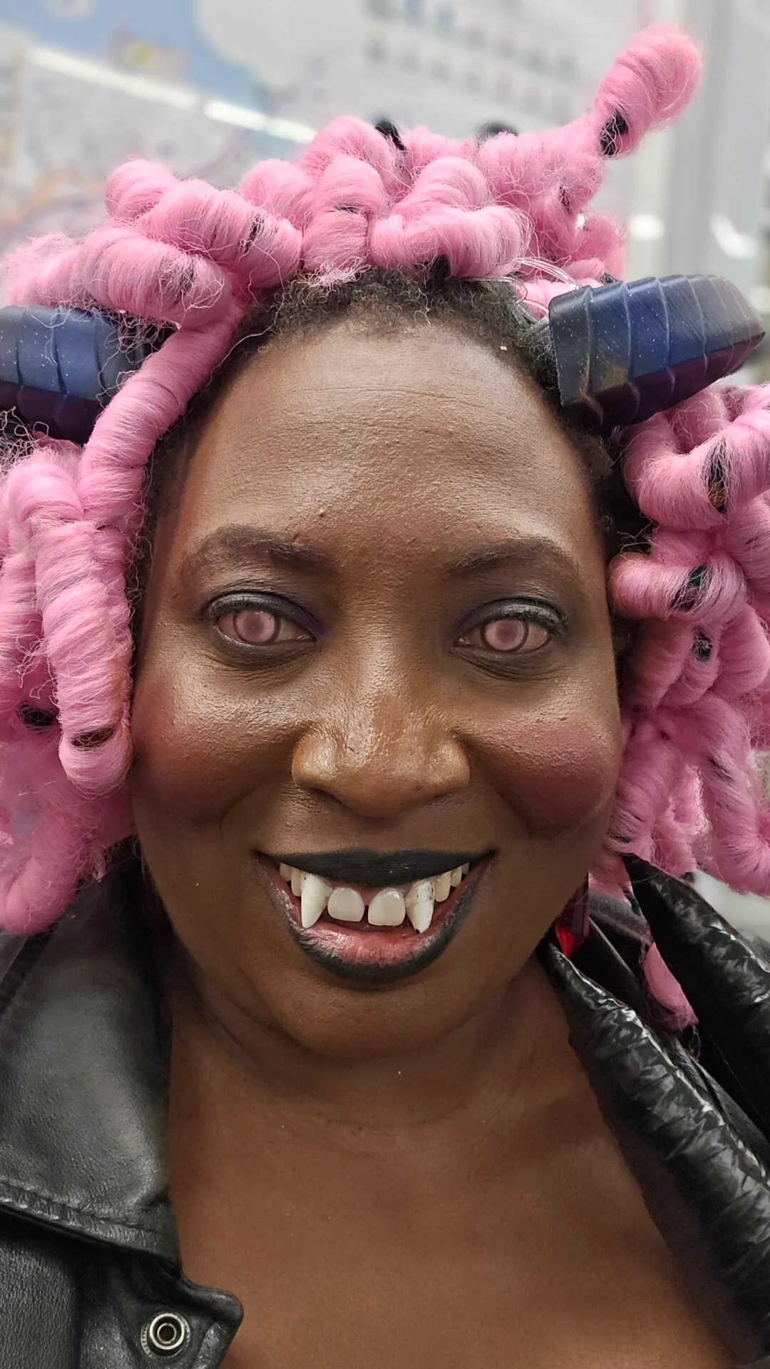 Давайте начнём с моего костюма на Хэллоуин в стиле Дротца Тзуэнта. Во всех трёх снимках цветовой тон и температура были очень близки, особенно в случае с моими розовыми локонами и тоном кожи мокко, за исключением iPhone 16 Pro Max, который был чуть темнее. Но в итоге победил Pixel 9 Pro XL, так как при увеличении на нём были самые чёткие детали, в том числе все выбившиеся волоски на бровях, которые сигнализируют о том, что мне пора сделать коррекцию бровей.
