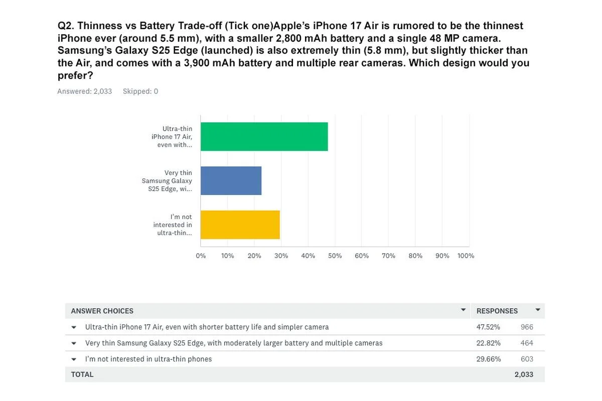 Хотя многие считают, что дизайн iPhone 17 Air лучше, чем у Samsung Galaxy S25 Edge, немалое число поклонников Apple отдают предпочтение последнему из-за сочетания аккумулятора ёмкостью 3900 мАч и толщины 5,8 мм, а не ожидаемому профилю в 5,5 мм и крошечному аккумулятору ёмкостью 2800 мАч.