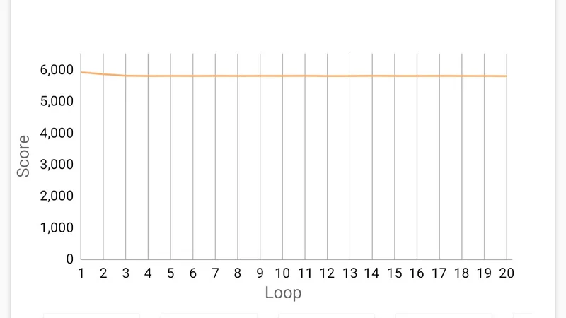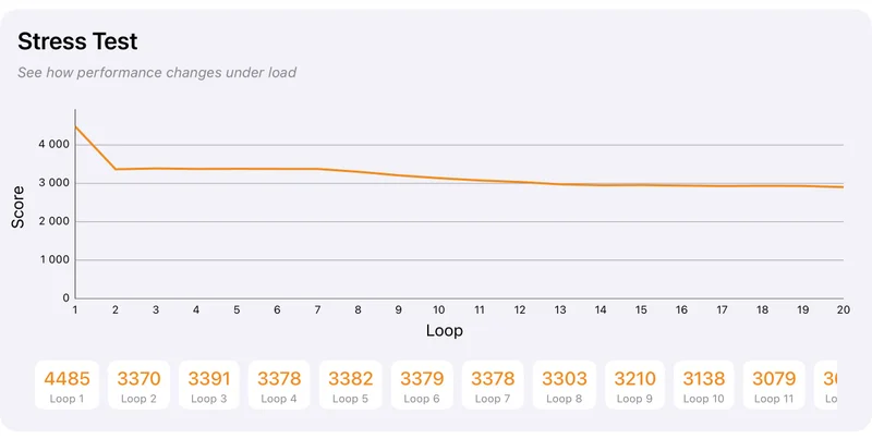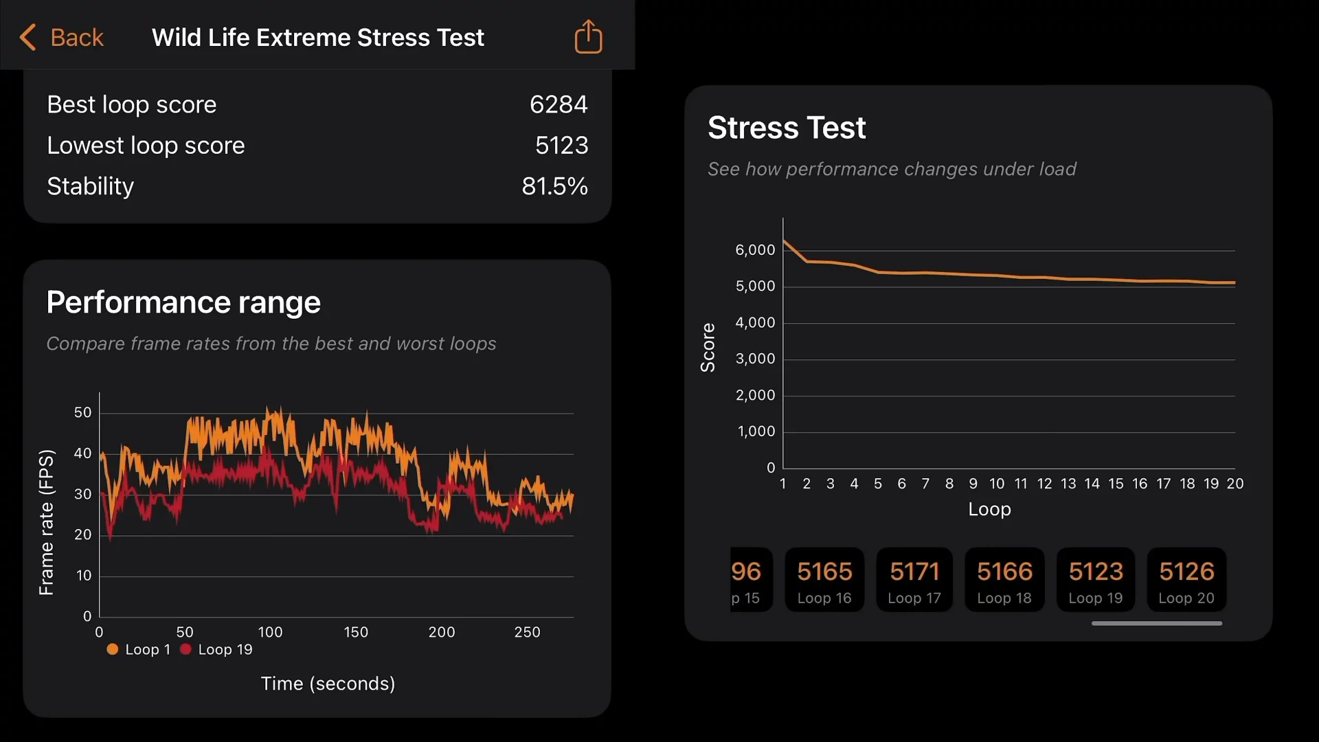 Для сравнения: при запуске того же теста наiPhone 16 Pro Maxпроизводительность значительно снижается.Показатель стабильности составляет всего 65 %, что намного хуже, чем 81 % у iPhone.