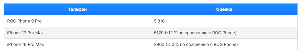 При длительных игровых сессияхiPhone 17 Pro Maxнабирает около 5120 баллов по сравнению с примерно 5810 баллами уROG Phone 9 Pro.