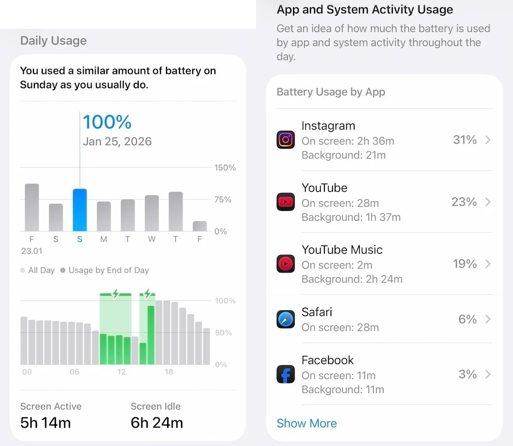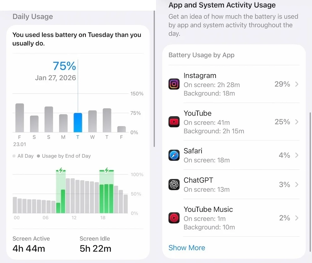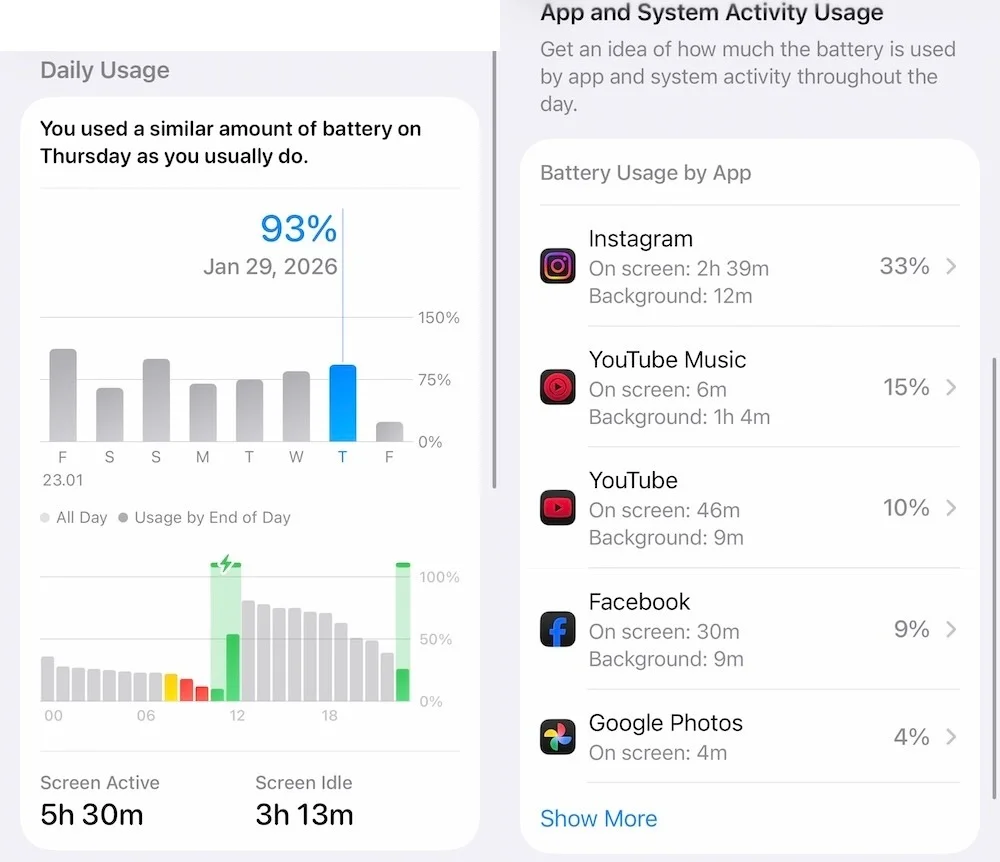 - Среднее время использования экрана при 100%: 5 часов 20 минут