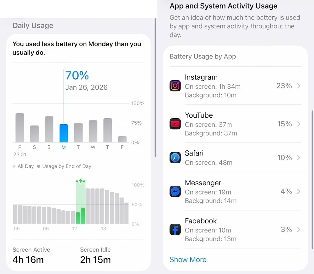 На практике это означает, что iPhone 17 Pro с лёгкостью выдерживает целый день активного использования, а расход заряда батареи предсказуемо увеличивается, а не резко падает во второй половине дня.