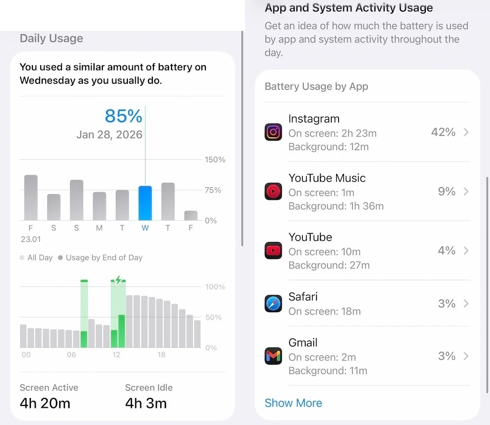 - Среднее время использования экрана при 80%: 4 часа 40 минут