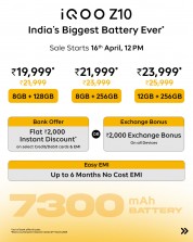 iQOO Z10 доступен в цветах Stellar Black и Glacier Silver по цене от 255 долларов США (21400 руб.). Официальные продажи начнутся 16 апреля в официальном интернет-магазине iQOO и на Amazon India.