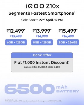 iQOO Z10x доступен в цветах «Ультрамарин» и «Титан» по цене от 162 доллара США (13600 руб.). Официальные продажи начнутся 22 апреля в официальном интернет-магазине iQOO и на Amazon в Индии.