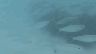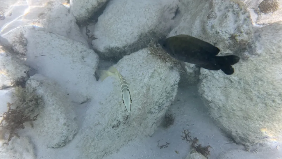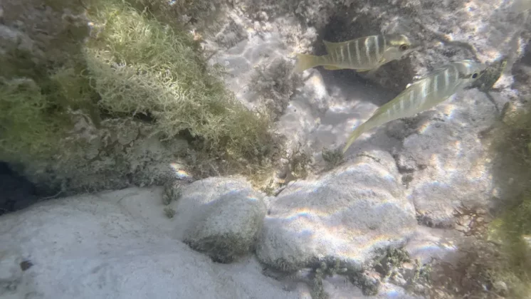 Однажды днём мы пошли по длинному пляжу к похожей на лагуну зоне, где вода была особенно чистой, спокойной и достаточно мелкой, чтобы пройти несколько десятков метров, не замочив грудь и плечи. Я сразу же заметил стайки маленьких белых рыбок, плавающих у моих ног. Затем я увидел других рыбок с полосками, несколько длинных и тонких, а также по крайней мере несколько более тёмных.
