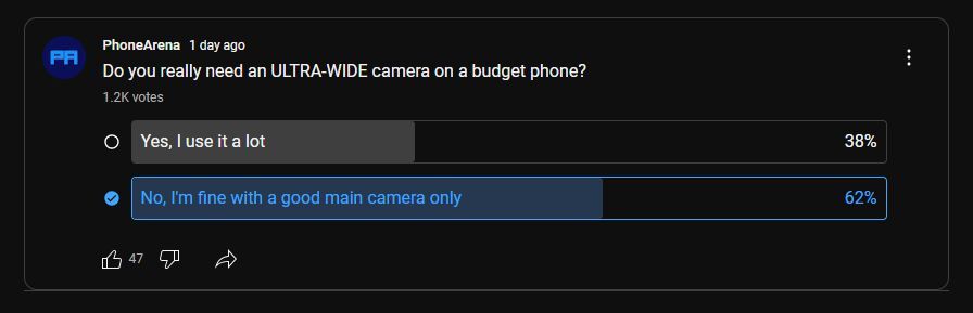 Следующим моим шагом было попросить коллегу провести простой опрос среди подписчиков нашего YouTube-канала, чтобы узнать, нужна ли им сверхширокоугольная камера или достаточно хорошей основной камеры. Результаты оказались довольно интересными.