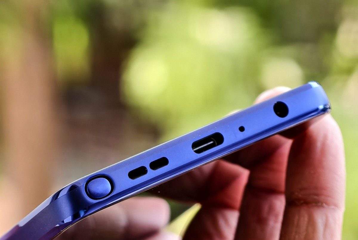 Переходим к задней панели. Здесь мы видим квадратный модуль камеры с четырьмя кружками — по одной для вспышки, основной камеры на 50 Мп, сверхширокоугольной камеры на 13 Мп и датчика «3 в 1», который представляет собой комбинацию датчиков окружающего света, уменьшения мерцания и RGB.