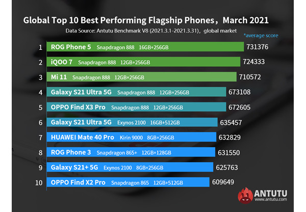 Бенчмарк AnTuTu опубликовал традиционный рейтинг самый мощных смартфонов 2021 года по состоянию на март.