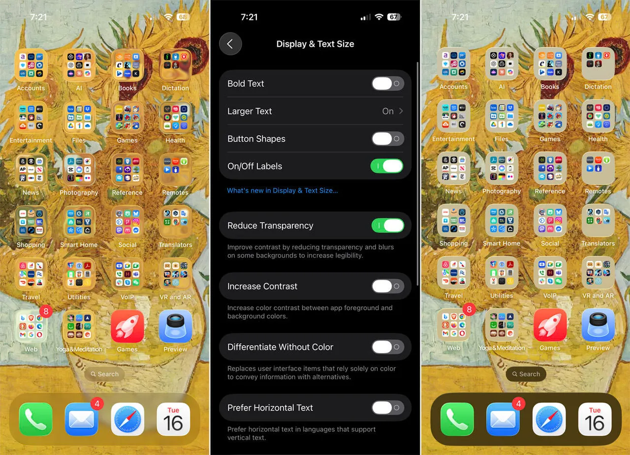 На iPhone с iOS 26 откройте «Настройки», выберите «Универсальный доступ», а затем нажмите «Экран и размер текста». Включите параметр «Уменьшить прозрачность». Вернитесь на главный экран, и вы увидите, что значки и папки стали менее прозрачными.