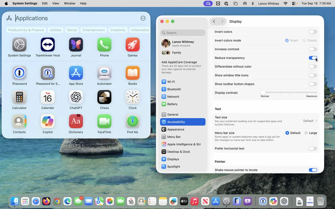 На Mac с MacOS 26 Tahoe перейдите в «Системные настройки» и выберите «Универсальный доступ». В разделе «Зрение» нажмите на параметр «Экран» и включите переключатель «Уменьшить прозрачность». Откройте окно, чтобы увидеть, как теперь выглядят папки и значки.