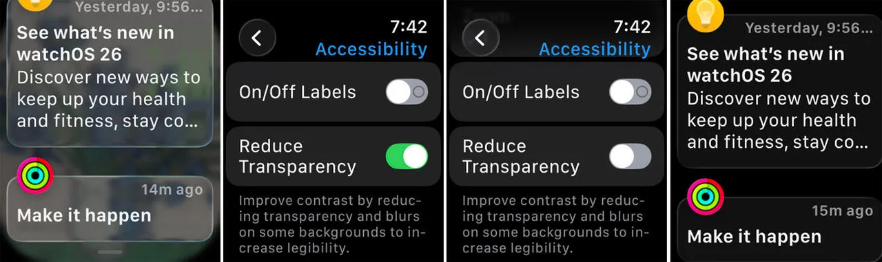 На Apple Watch с WatchOS 26 действия аналогичны. Откройте приложение «Настройки» на часах, выберите «Универсальный доступ», а затем включите параметр «Уменьшить прозрачность». Чтобы увидеть, как уменьшение прозрачности влияет на внешний вид, проведите пальцем вниз по экрану, чтобы просмотреть последние уведомления. Вы заметите, что панели уведомлений больше не выглядят прозрачными.