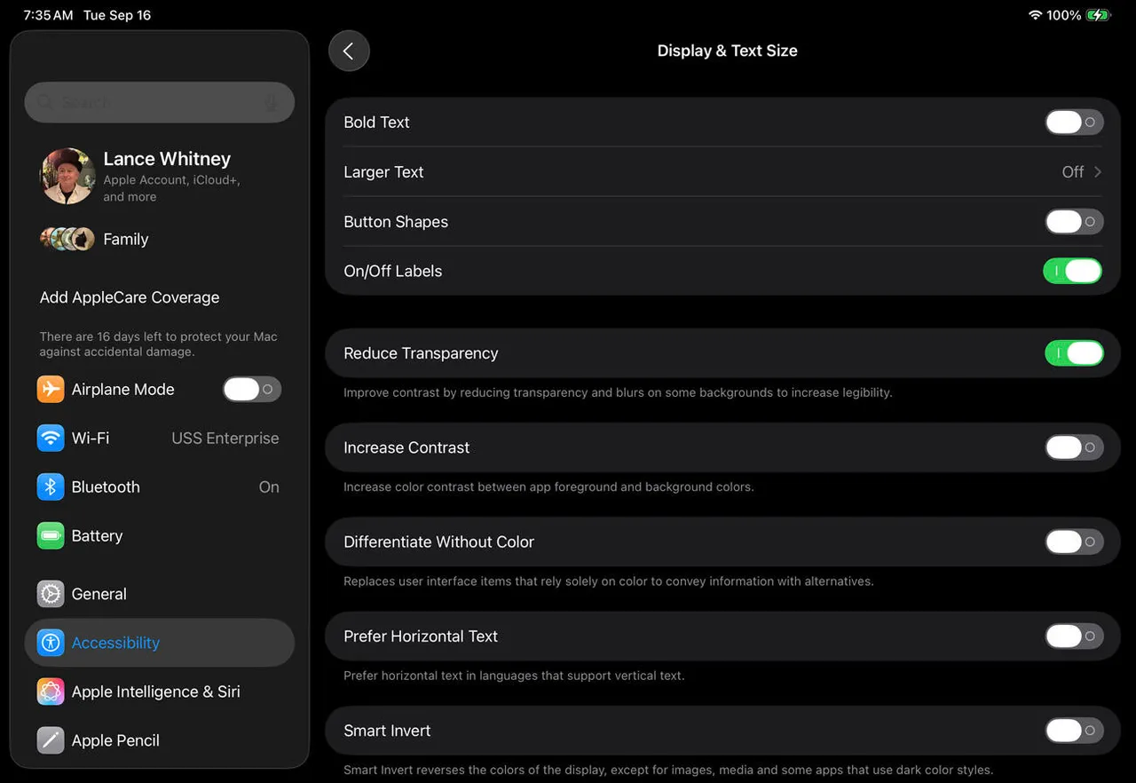 На iPad с iPadOS 26 процесс происходит точно так же. Зайдите в «Настройки» и выберите «Универсальный доступ». Перейдите на экран «Экран и размер текста» и включите параметр «Уменьшить прозрачность». Снова откройте любой главный экран с иконками и папками и посмотрите, нравится ли вам менее прозрачный вид.
