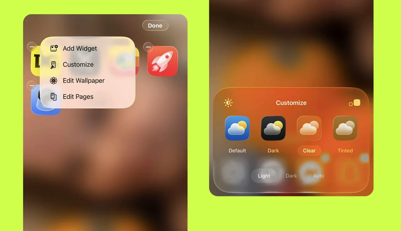 Да. Вы можете изменить внешний вид Liquid Glass на главном экране, просто настроив значки приложений и виджеты. Вы можете сделать их полупрозрачными («прозрачными»), окрасить в любой цвет, переключаться между светлым и тёмным режимами, изменять размер значков и т. д.