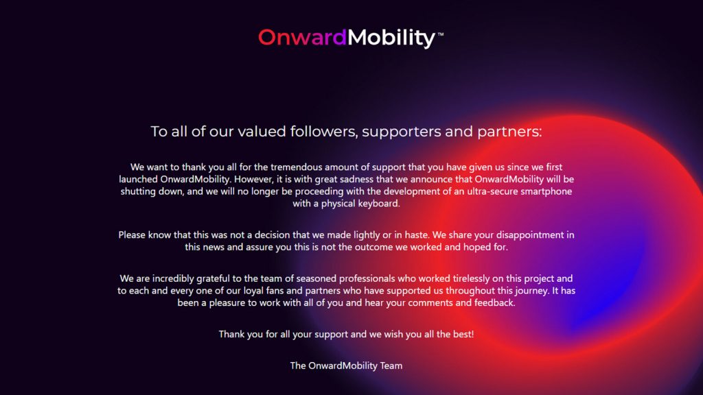 Эта потеря брендинга BlackBerry в сочетании со сложными и длительными сроками, с которыми приходилось иметь дело OnwardMobility, были, по-видимому, факторами, повлиявшими на решение ap отказаться от проекта. Менее чем через неделю компания объявила, что полностью закрывается, а ее веб-сайт был заменен единственным заявлением (на фото ниже), в котором она благодарила фанатов за их поддержку и сетовала на решение закрыть магазин.