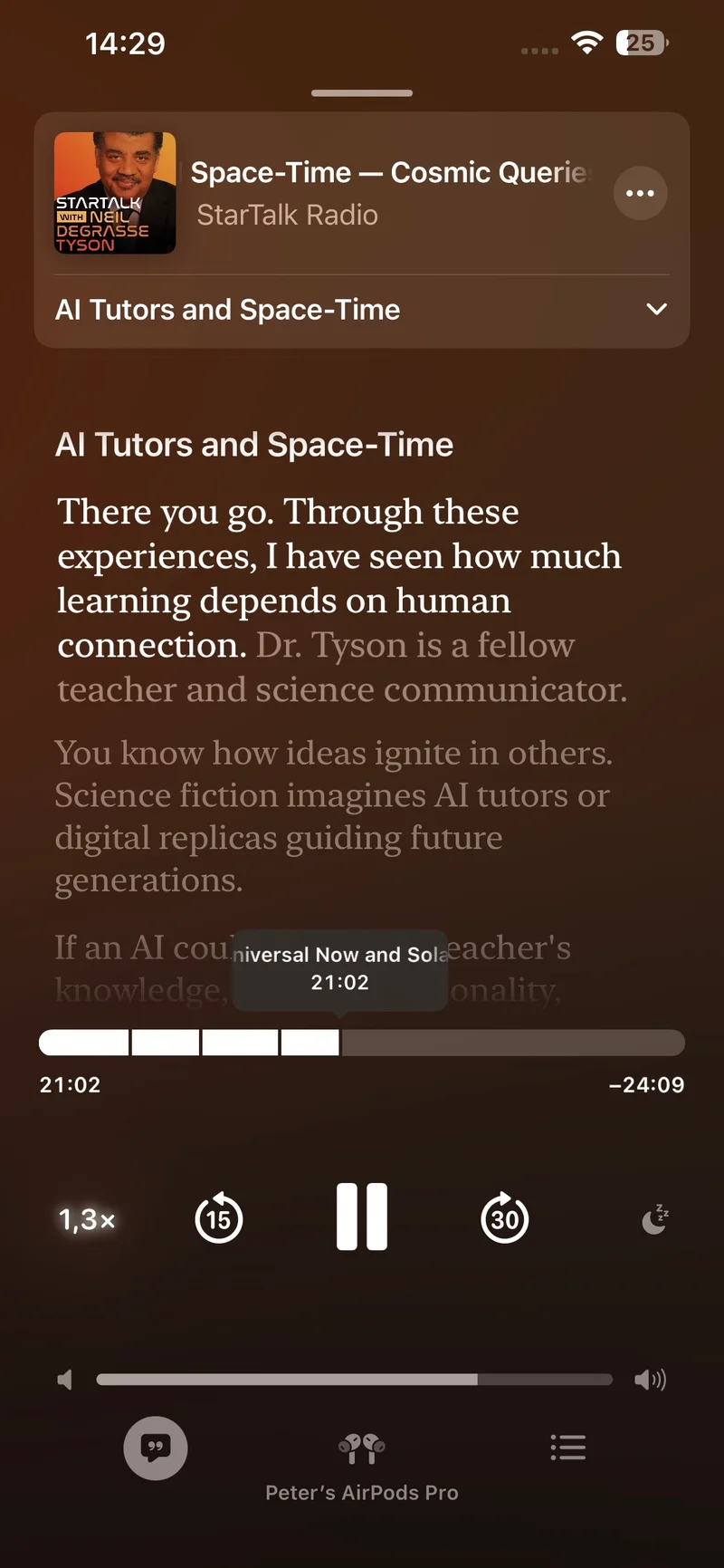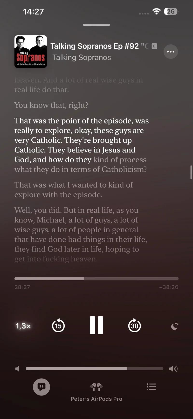 Еще одна новая функция — транскрибация. Теперь весь подкаст будет представлен в виде текста, так что вы сможете легко прочитать его, если что-то пропустили. Более того, если вы нажмете на любое предложение или абзац в тексте, подкаст начнет воспроизводиться именно с этого момента. Это позволяет быстро найти интересующий вас фрагмент. Наконец, если в подкасте есть какие-либо ссылки, Apple позволит быстро и легко переходить по ним.
