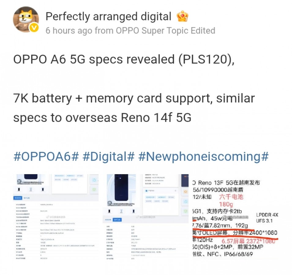 На сайте TENAA был замечен ранее не анонсированный телефон Oppo, получивший сертификацию под названием модели PLS120. Скорее всего, это будет Oppo A6 5G. Его характеристики довольно похожи на характеристики Reno 14F 5G, но есть и некоторые отличия.