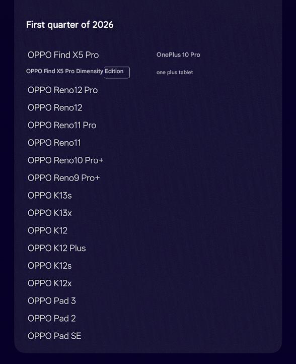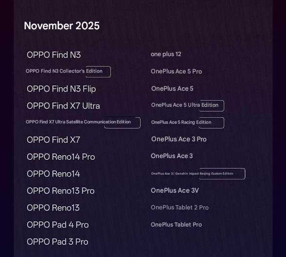 Развертывание ColorOS 16 начнется в Китае с 30 октября 2025 года. Первая партия устройств, которые получат новый интерфейс, включает серию Find X8, Find N5 и китайские версии OnePlus 13 и 13T. Развертывание продолжится в ближайшие месяцы. Серия Oppo Find X9 будет поставляться с ColorOS 16 из коробки.