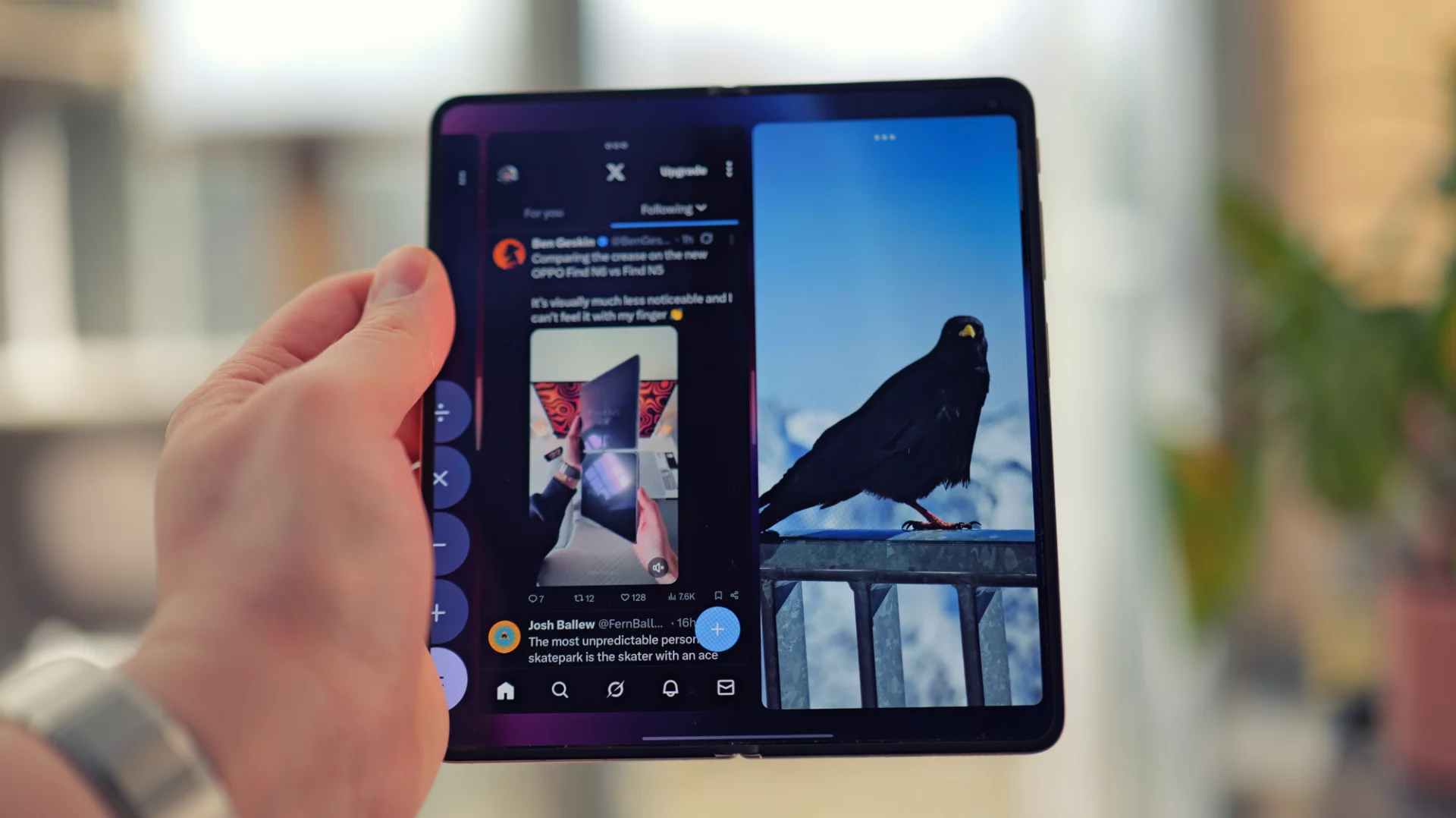 Лично для меня главная фишка — почти невидимая складка на внутреннем экране. Конечно, Oppo не смогла обмануть физику, и место сгиба всё ещё можно разглядеть под углом, но это наименее заметная складка среди всех складных устройств на сегодняшний день.
