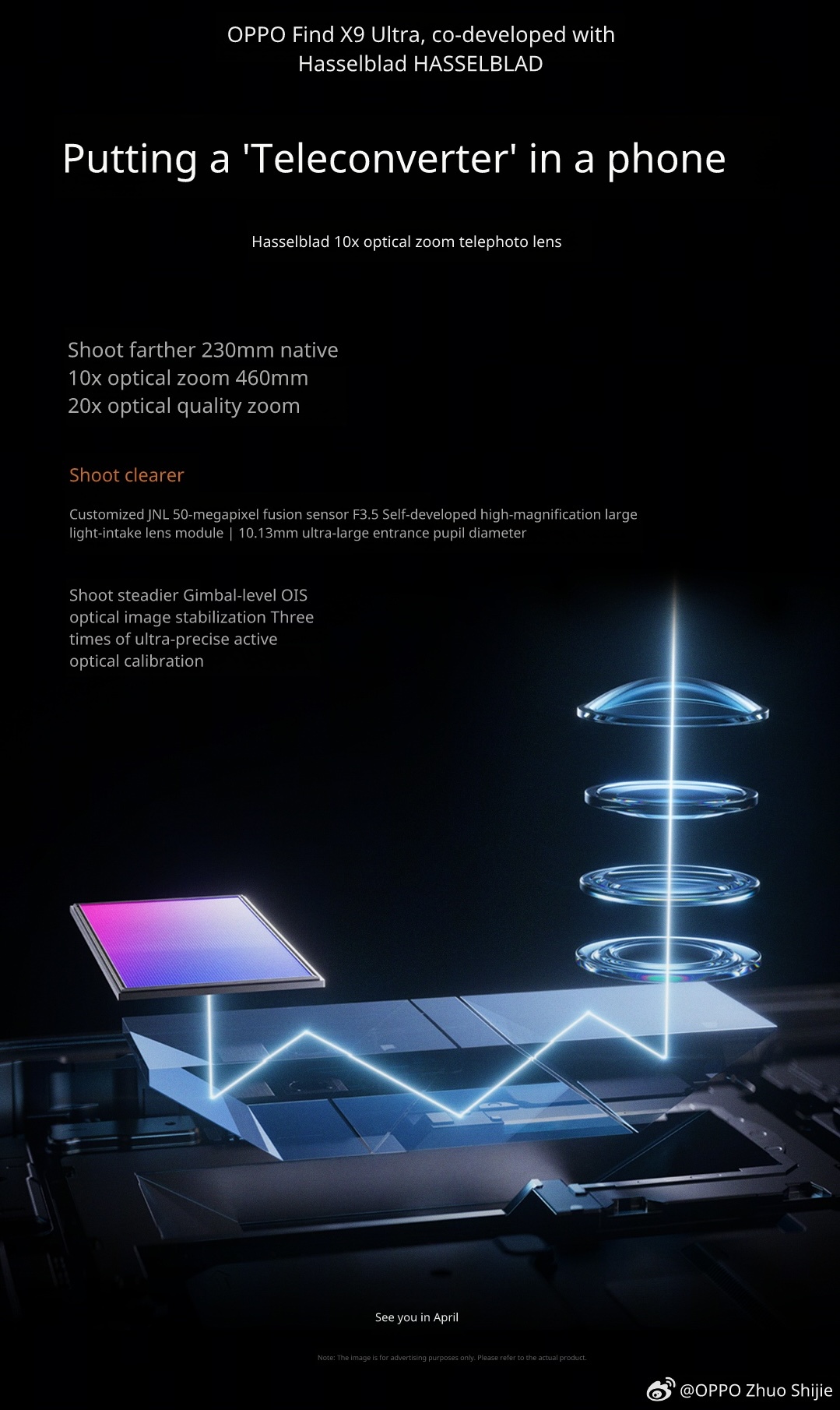 Новая система обеспечивает честное фокусное расстояние 230 мм. При этом разработчики обещают, что даже на 20-кратном увеличении качество картинки останется на высоте. В камере используют специальный сенсор Samsung JNL на 50 Мп. Диафрагма объектива составит f/3.5, а за четкость кадров будет отвечать продвинутая оптическая стабилизация. По уровню работы она сопоставима с профессиональными подвесами.