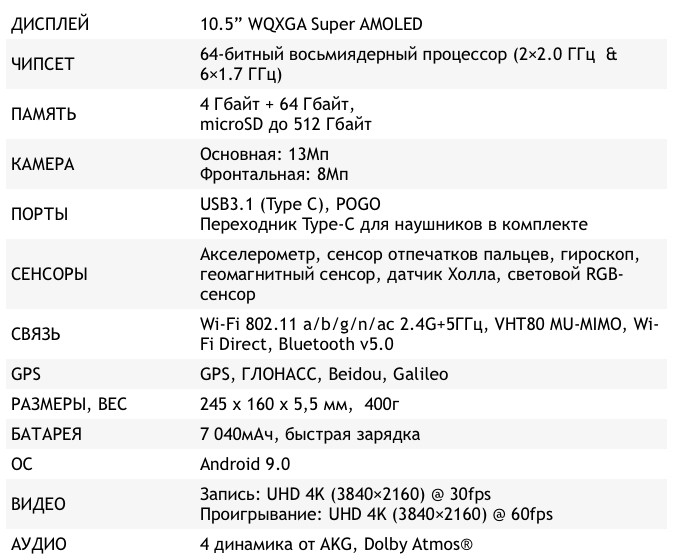 Galaxy Tab S5e получил 10,5 дюймовый Super AMOLED-экран, 64-битный восьмиядерный процессор (возможно, речь идет о новом Exynos, но точной информации пока нет). Объем оперативной и встроенной памяти составляет 4 и 64 Гбайт соответственно. Поддерживаются карты MicroSD до 512 Гбайт. Основная камера новинки 13 мегапиксельная, фронтальная – 8 мегапикселей. Планшет позволяет записывать 4К-видео с частотой 30 кадров в секунду и воспроизводить 4К видео с частотой 60 кадров в секунду. Как и его предшественник, Galaxy Tab S5e оснащен сразу четырьмя динамиками AKG, которые в совокупности дают отличный звук. К сожалению, разъема для наушников больше нет, но в Samsung пообещали класть в комплекте переходник с 3,5мм на USB Type C.