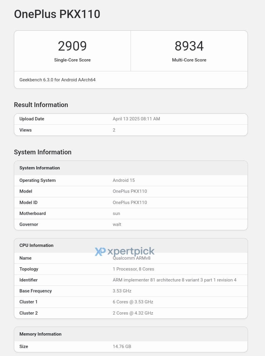 Устройство указано под номером модели PKX110 и смогло набрать 2900 баллов в одноядерном и 8934 балла в многоядерном тестах. Оно оснащено процессором Snapdragon 8 Elite, графическим процессором Adreno 830 и Android 15.