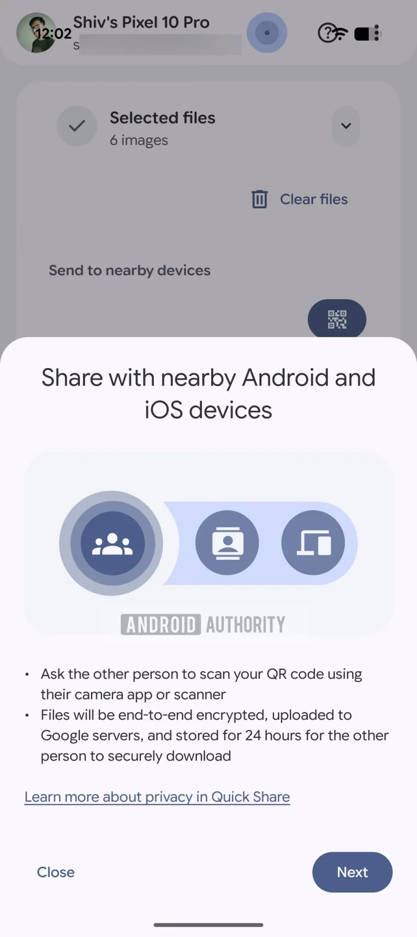 Четвёртое изображение выше также подтверждает, что контент, отправленный с Android на iPhone через функцию «Быстрый обмен», сначала шифруется и загружается на серверы Google. Эти файлы будут храниться в течение 24 часов, чтобы пользователь iPhone мог их скачать. Этот подход существенно отличается от обмена файлами между устройствами Android, который происходит в автономном режиме.