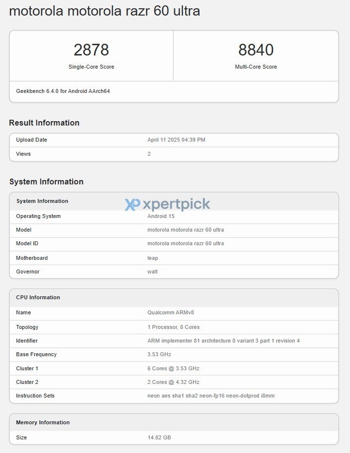 Премиальная модель Razr 60 Ultra (также известная в США как Razr Plus (2025)) только что появилась в Geekbench, подтвердив, что под капотом действительно находится мощный процессор Snapdragon 8 Elite, как и ожидалось ранее.