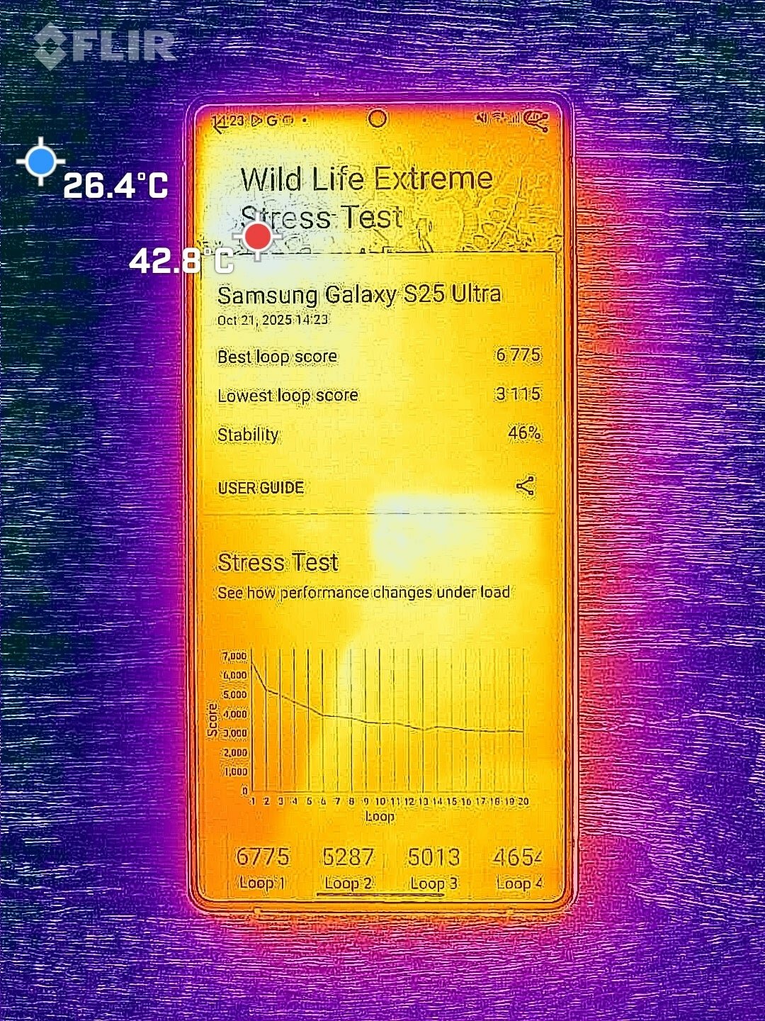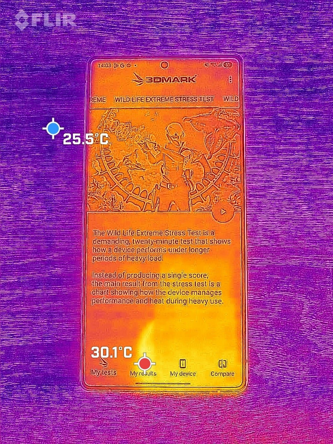 Производительность телефона резко падает после первого прохода стресс-теста 3DMark WildLife Extreme, и даже последовательные прогоны Geekbench дают более низкие результаты. Речь идёт о показателе стабильности 46%, что довольно мало. Не говоря уже о том, что телефон сильно нагревается, как видно на снимках FLIR выше.