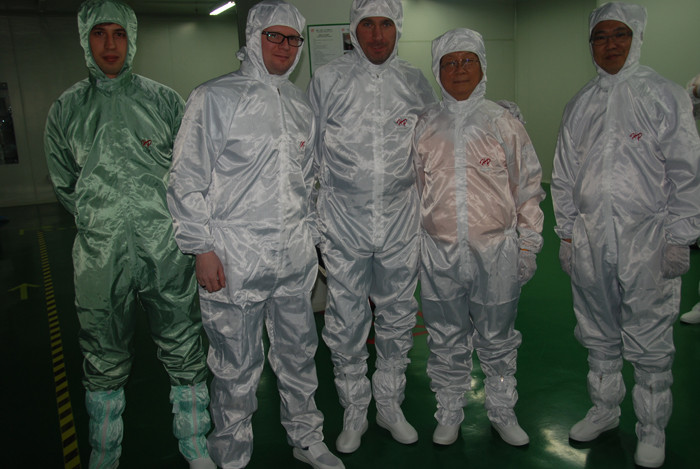Каждый работник и посетитель цехов Hi-P надевает специальный костюм и проходит очистку от пыли. При входе используется современная система безопасности.