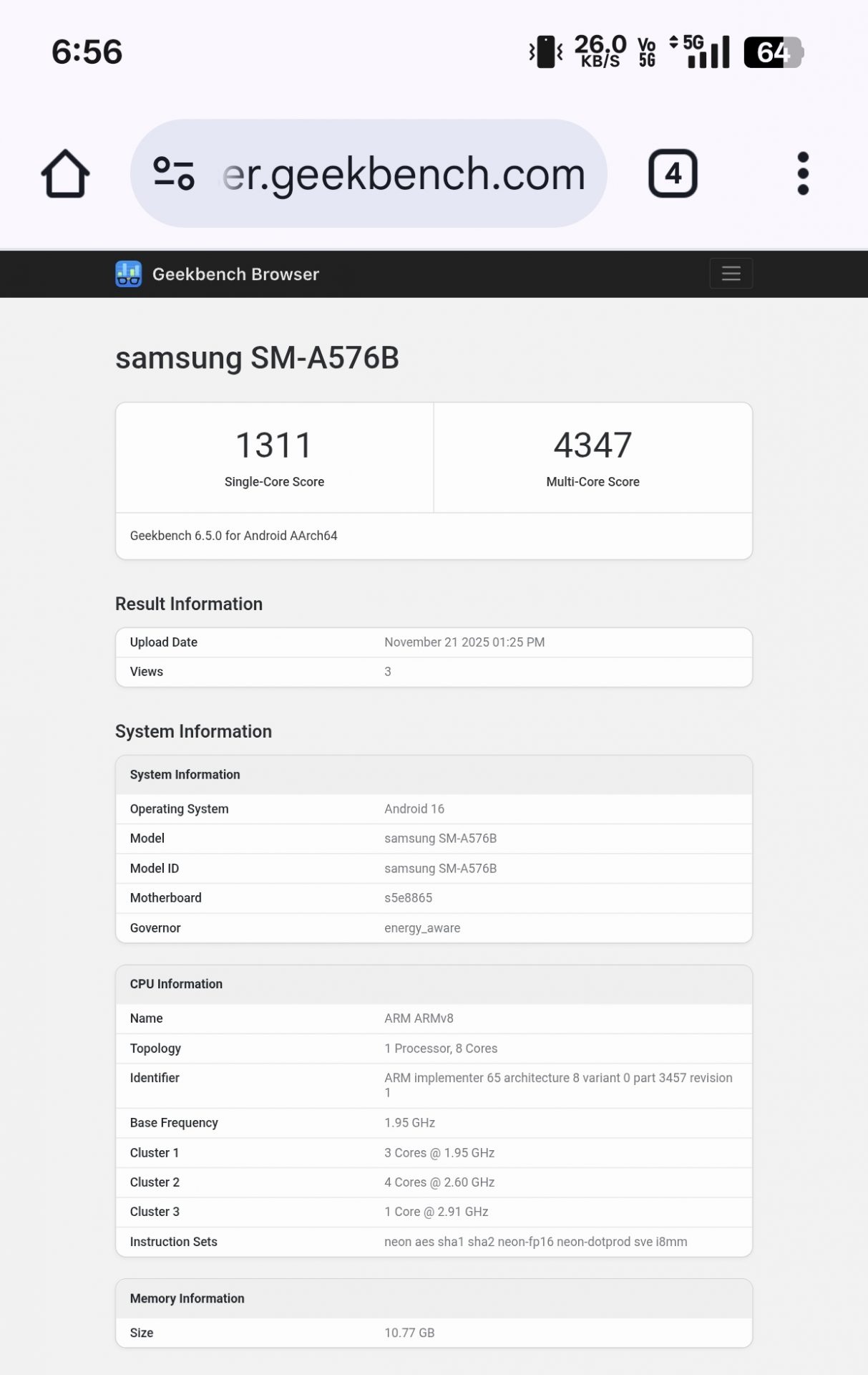 Смартфон Samsung Galaxy A57 (SM-A576B) появился в Geekbench. Он оснащён фирменным процессором Exynos 1680 от Samsung.