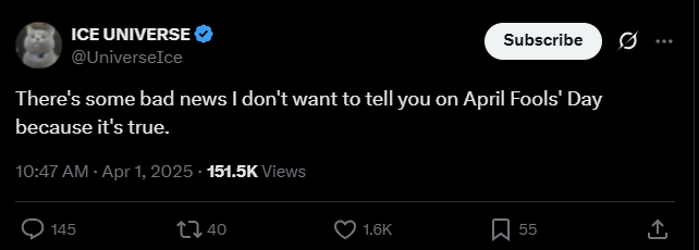 Затем наступило 2 апреля, и Ice Universe сообщила «плохие новости»: