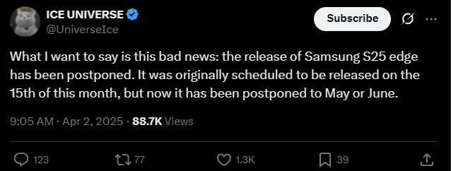 Выход Galaxy S25 Edge, предположительно, откладывается — вот и всё. Он должен был выйти 15 апреля, но его выпуск перенесли на май или июнь.
